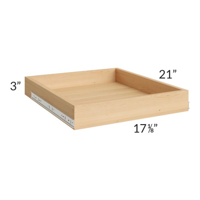 Roll out tray for a 21" base cabinet. The drawer glides and wood finish for the roll out tray will be the same as the standard drawers for this collection. **Please note, if using with a partial overlay collection (Tribeca Shaker or Glazed Praline), order according to the width of a cabinet, for example, the 15" roll out tray fits a 15" wide base cabinet. For full overlay collections, order according to the width of the cabinet if the roll out is NOT being installed between the hinges. If it will be installed between hinges, order 1 size smaller (for example use the 15" roll out for an 18" wide base cabinet) and use included shims for installation so the tray clears the hinges when opening**