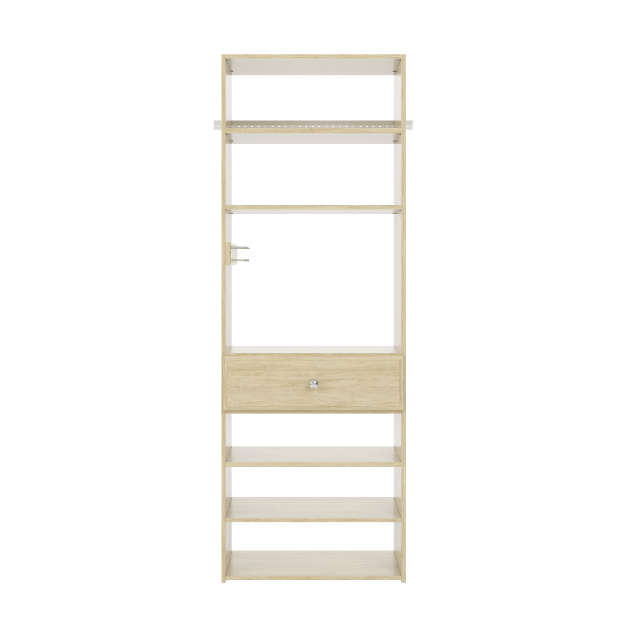 Easy Track's Accessory Tower is the space that holds all the finishing touches to your everyday attire. Say goodbye to scattered items that don't have a home! No more rushing out the door in search of unfound items or staring at unmanageable clutter. House your jewelry, purses, shoes, and more in this thoughtful space. Avoid tangled necklaces with a holding hook rack. Store shoes of any height with adjustable shelving. Use the drawer for hidden storage.