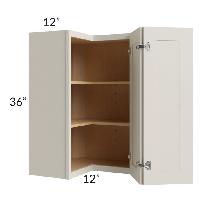 Wall diagonal corner cabinet that takes up 24" from the corner out, on each wall. This cabinet comes with 2 adjustable shelves.