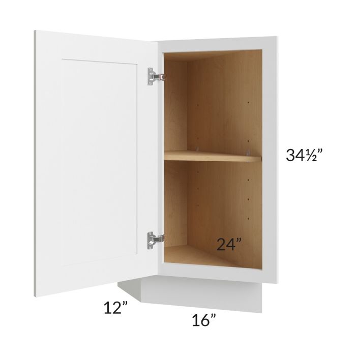 Full height door cabinet that is meant to be used at the end of a cabinet run. It will have a 24" deep side on the right which gets installed against the adjacent cabinet. The door is 16" wide and angled. The exposed side of the cabinet (on the left) will be 12" deep. The door will always be hinged on the 12" deep side.