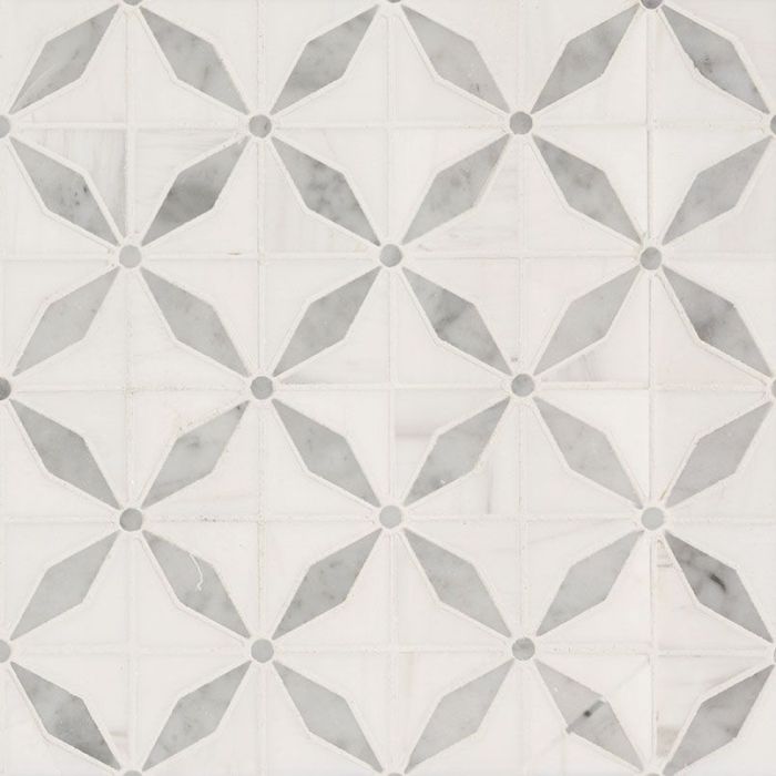 Bianco Starlite Marble Geometric Tile will pretty up any space with the white marble geometric tiles with modern star-like shapes in gray. The neutral color and design of this backsplash tile complement any design style, and they can be featured as patterned wall tiles, kitchen or bathroom countertops, and geometric floor tiles.