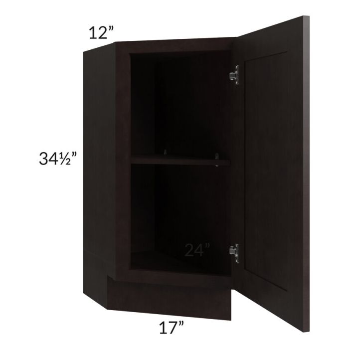 Full height door cabinet that is meant to be used at the end of a cabinet run. It will have a 24" deep side on the right which gets installed against the adjacent cabinet. The door is angled and the exposed side of the cabinet (on the left) will be 12" deep. Comes with 1 shelf.