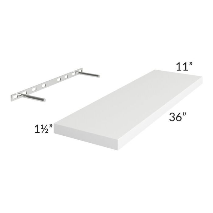 Floating shelf that will also include the mounting hardware. Once mounted, the shelf will be able to move or 'float' to the left and right. Each shelf can hold up to 25lbs. It can be trimmed up to 1/2 on each side but then will have a raw exposed edge so should be placed adjacent to a cabinet, panel, wall, etc... or the raw edge will have to be finished.