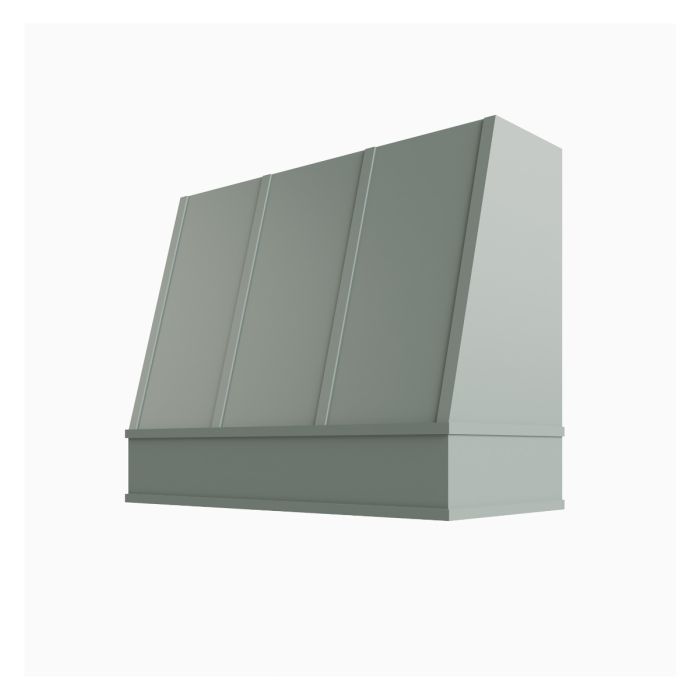 Strapped, angled hood with block molding. Features a plywood and Maple construction. The hood base front panel is 42" but at the widest point with the molding, the total width is 43-1/2". The side panel is 19-1/2" deep, and 20-1/4" deep with the molding. The top of the chimney is 42" wide and 14-1/2" deep and the chimney section is trimmable by 6" to make the total height 30", if needed. The height of the panel and molding section on bottom is 8-1/4". The hood has a two-piece construction for easy mounting and access to fan and ducting. Ships assembled.