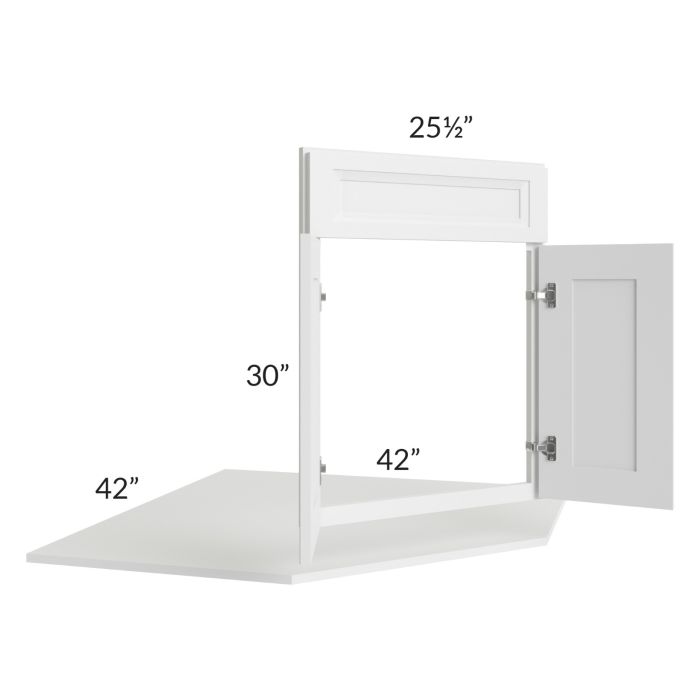 Corner sink base front and floor. Finished toe kick is not included. Once installed, this will take up 42" of wall space from the corner out, on each wall. These items should be installed between two cabinets, they cannot be used with an appliance directly on either side. To ensure proper installation, additional countertop support will be needed along the back wall and corner area. Additionally, a base support should be built on-site to provide adequate stability. Please note that hardware is not provided to attach this item to adjacent cabinets due to the flexibility and versatility of the item and how it could be used.