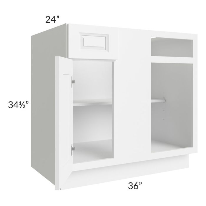1 door blind base corner cabinet. The actual width is 36" however it will take up a minimum of 39" of wall space and can be pulled up to 42". This cabinet has 1 drawer and is reversible. The door/drawer width is 11-9/16”, blind opening is 8 7/8”. The drawer and door opening will be 3" less than the width of the door and drawer front. A filler will be needed between the blind and adjacent cabinet to ensure the drawer and door open properly; the filler must be purchased separately.