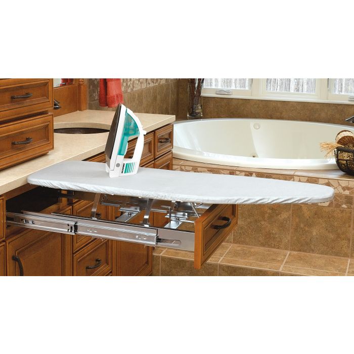 The uniquely designed expandable frame mounts easily in a vanity drawer between cabinet sides from 14.25" to 21" wide and the fixed brackets allow for easy mounting of all standard drawer fronts. It features a chrome finish and unique ball-bearing slide system that provides sufficient over travel for maximum utilization. Simply open until the gravity lock engages, unfold board and you are ready to iron!