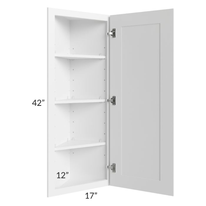 Wall end angle cabinet that has 3 adjustable shelves. The front of the cabinet is 17" wide.