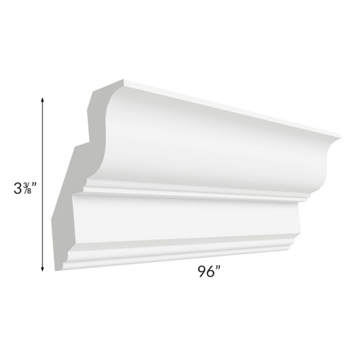 Crown molding that comes in 8 ft long sections. When applying crown to full overlay cabinets, a crown backer will be required (block of wood that is installed to the top of the cabinet where the crown will be attached to). When installed, crown is 3-3/8"H and sticks out from the cabinet 2-1/2". There is a flat part to accommodate a rope insert (ROPE8) installation if desired.