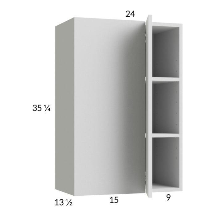 Blind corner wall cabinet that takes up a minimum of 24" of wall space and can be pulled up to 27". The actual cabinet width is 24", it can be installed right against the corner if needed, or pulled a maximum of 3" from the corner. This cabinet is reversible. The door width is 9" and the blind section width is 15". A filler must be installed between the blind cabinet and the adjacent wall cabinet (so it's perpendicular to the blind cabinet).
