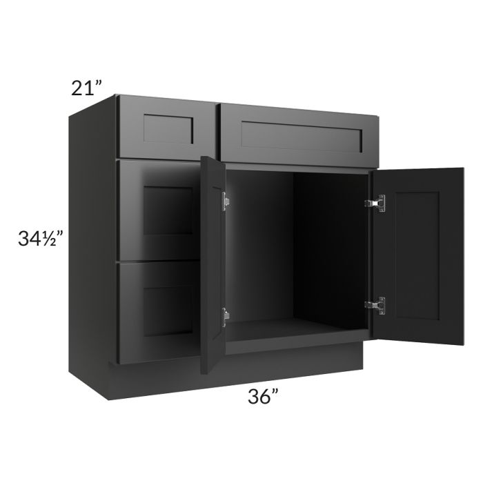 Description / Kingston Steel Grey Shaker 36" Vanity Sink Base Cabinet (Drawers on Left)