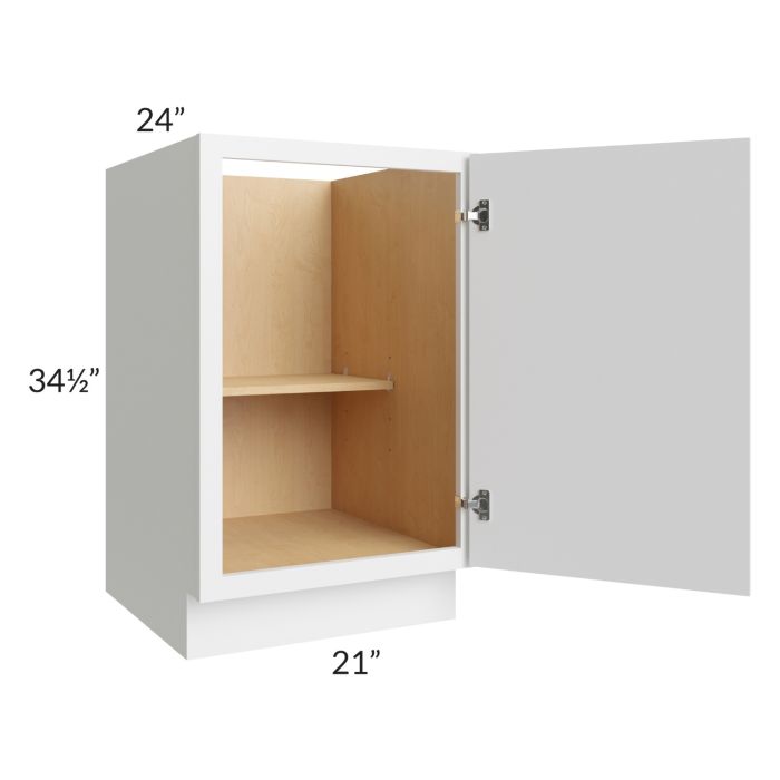 1 door base cabinet with 1 full height door and 1 shelf. A regular 21" base cabinet with a drawer will be shipped in addition to a full height face frame and door. The face frame, door and drawer box that comes with the 21" cabinet can be discarded and the full height face frame and door will be installed on the cabinet box.