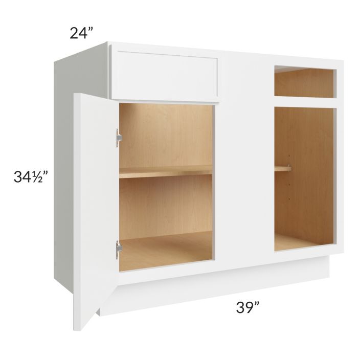 1 door blind base corner cabinet that takes up a minimum of 42-1/2" of wall space and can be pulled up to 49". The actual cabinet width is 39" and has a minimum pull of 3-1/2" and a maximum pull of 10" from the corner. This cabinet has 1 drawer and is reversible. The door measurements are 15-7/8W x 22-1/2H x 3/4D. The drawer front measurements are 15-3/4W x 6 1/4H x 3/4D. The drawer box is 12-3/8W x 3 3/8H x 20-3/8D and the door opening is 12-3/4"W x 20-1/2"H. The stile between the door opening and blind opening is 10" wide. A filler must be installed between the blind cabinet and the adjacent wall cabinet (so it's perpendicular to the blind cabinet).