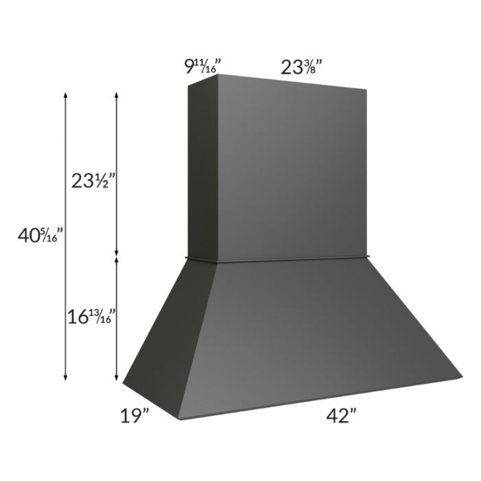 Euro style wood hood that comes with a stainless steel liner. The chimney height of 23-1/2" can be trimmed on site, if needed. Blower is not included and would need to be purchased separately. The chimney depth is 9-11/16" and the width is 23-3/8".
