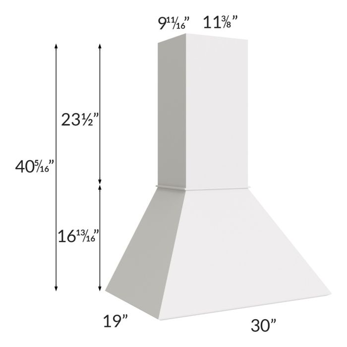 Euro style wood hood that comes with a stainless steel liner. The chimney height of 23-1/2" can be trimmed on site, if needed. Blower is not included and would need to be purchased separately. The chimney depth is 9-11/16" and the width is 11-3/8".