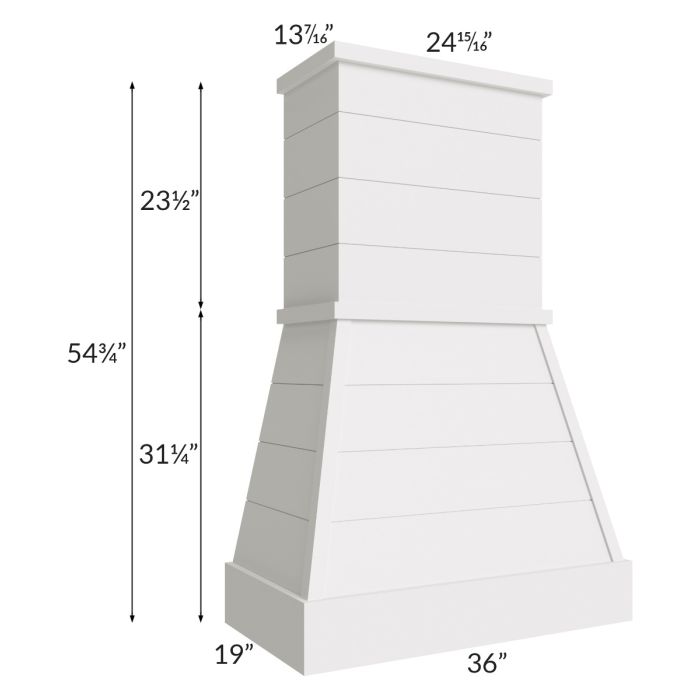 Farmhouse style wood hood that comes with a stainless steel liner. The chimney height of 23-1/2" can be trimmed on site, if needed. Blower is not included and would need to be purchased separately. The chimney depth is 13-7/16" and the width is 24-15/16".