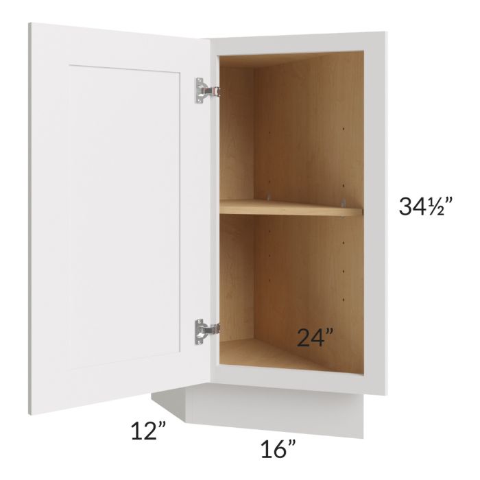 Full height door cabinet that is meant to be used at the end of a cabinet run. It will have a 24" deep side on the right which gets installed against the adjacent cabinet. The door is 16" wide and angled. The exposed side of the cabinet (on the left) will be 12" deep. The door will always be hinged on the 12" deep side.