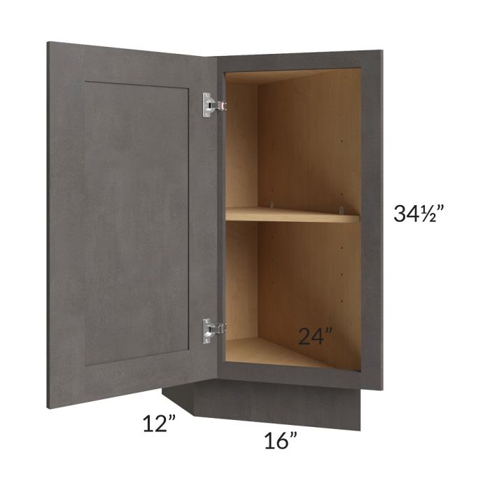 Full height door cabinet that is meant to be used at the end of a cabinet run. It will have a 24" deep side on the right which gets installed against the adjacent cabinet. The door is 16" wide and angled. The exposed side of the cabinet (on the left) will be 12" deep. The door will always be hinged on the 12" deep side.