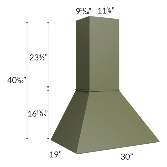 Euro style wood hood that comes with a stainless steel liner. The chimney height of 23-1/2" can be trimmed on site, if needed. Blower is not included and would need to be purchased separately. The chimney depth is 9-11/16" and the width is 11-3/8".