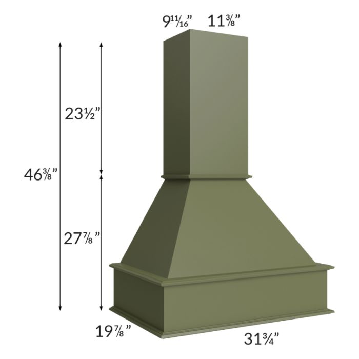 Signature style wood hood that comes with a stainless steel liner. The chimney height of 23-1/2" can be trimmed on site, if needed. Blower is not included and would need to be purchased separately. The chimney depth is 9-11/16" and the width is 11-3/8".