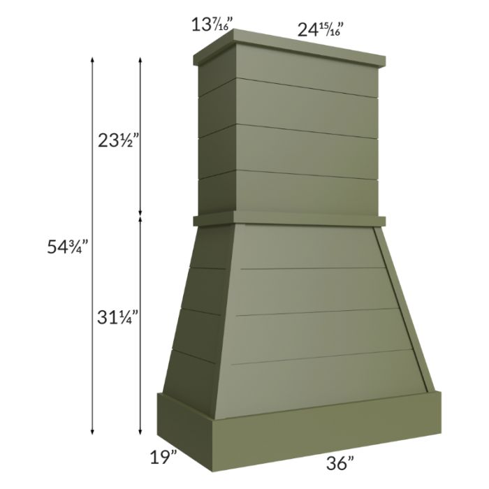 Farmhouse style wood hood that comes with a stainless steel liner. The chimney height of 23-1/2" can be trimmed on site, if needed. Blower is not included and would need to be purchased separately. The chimney depth is 13-7/16" and the width is 24-15/16".