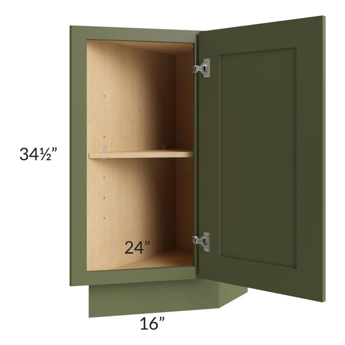Full height door cabinet that is meant to be used at the end of a cabinet run. It will have a 24" deep side on the left which gets installed against the adjacent cabinet. The door is 16" wide and angled. The exposed side of the cabinet (on the right) will be 12" deep.