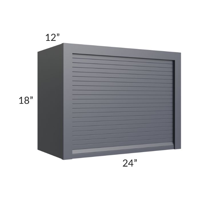 Appliance garage with a roll up, tambour door and is designed to fit under a 24" wide wall cabinet.
