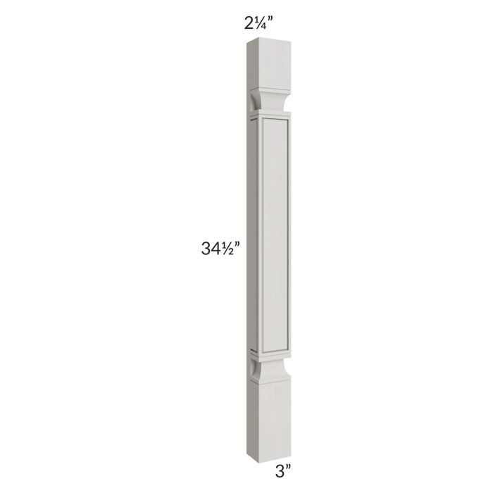 Base plain pilaster. The filler the pilaster is mounted on is 3/4" deep, the pilaster itself is 1-1/2" deep. Top section above the pilaster is 4" tall, and bottom section below the pilaster is 6-1/4" tall. 2" will need to be trimmed from the top or bottom before installation. **Pilasters are handmade and may therefore feature inconsistencies in shape or form. These are in no way considered defects**