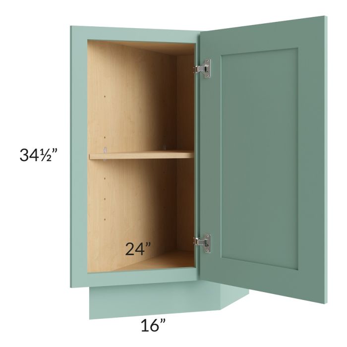 Full height door cabinet that is meant to be used at the end of a cabinet run. It will have a 24" deep side on the left which gets installed against the adjacent cabinet. The door is 16" wide and angled. The exposed side of the cabinet (on the right) will be 12" deep.