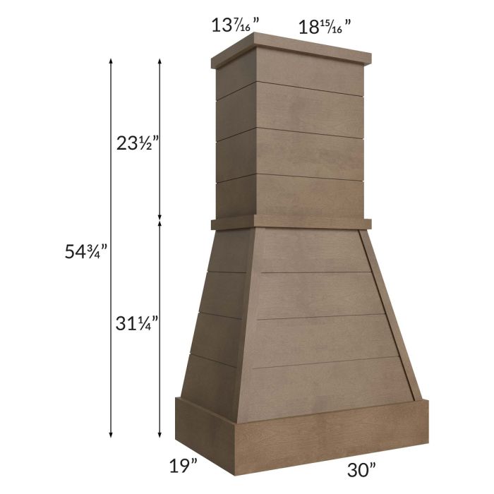 Farmhouse style wood hood that comes with a stainless steel liner. The chimney height of 23-1/2" can be trimmed on site, if needed. Blower is not included and would need to be purchased separately. The chimney depth is 13-7/16" and the width is 18-15/16".