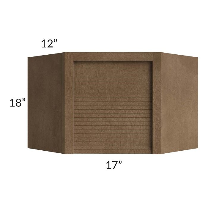 Appliance garage with a front width of 17". It will have a roll up, tambour door and is designed to fit under a 24x24 diagonal corner wall cabinet. The door opening is approximately 14" wide, the tambour door is partially inserted into the frame on either side.