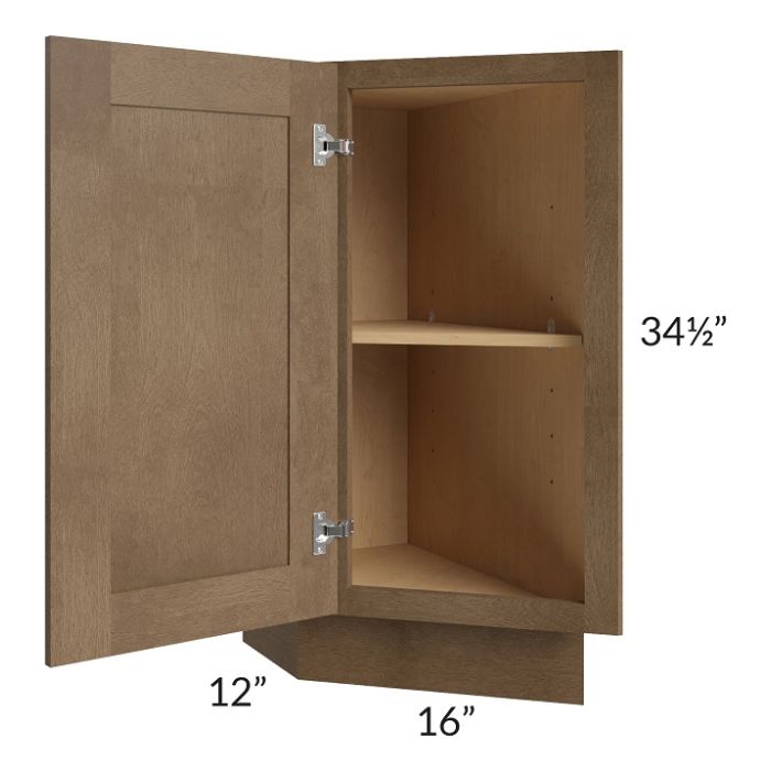 Full height door cabinet that is meant to be used at the end of a cabinet run. It will have a 24" deep side on the right which gets installed against the adjacent cabinet. The door is 16" wide and angled. The exposed side of the cabinet (on the left) will be 12" deep.