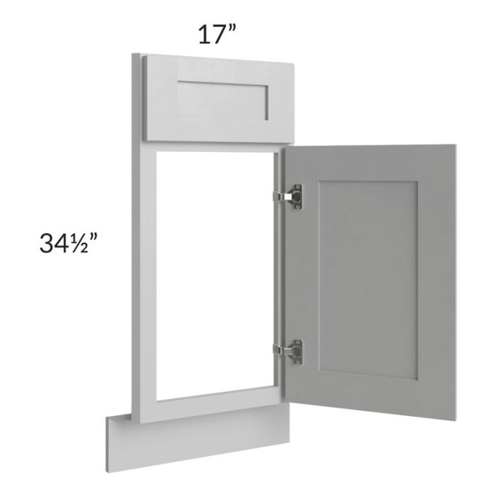 Diagonal corner sink front that will take up 36" of wall space from the corner out, on each wall, once installed. The door width is 14-1/2" and the face frame width is 17". This cabinet will have a partial overlay door to ensure it opens without hitting the adjacent cabinet, so there will be about 1-1/8" of face frame, visible on either side of the door. The corner sink front floor must be ordered separately (SKU DSFL36).