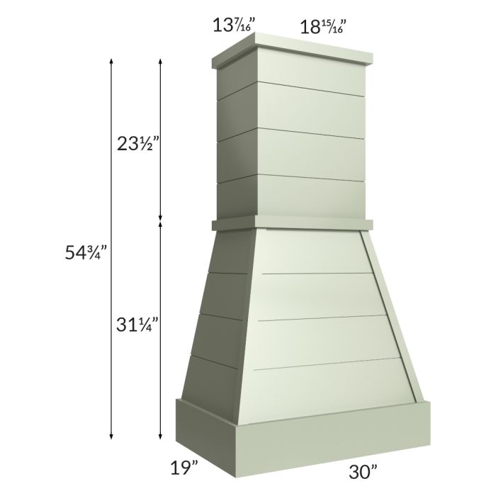 Farmhouse style wood hood that comes with a stainless steel liner. The chimney height of 23-1/2" can be trimmed on site, if needed. Blower is not included and would need to be purchased separately. The chimney depth is 13-7/16" and the width is 18-15/16".