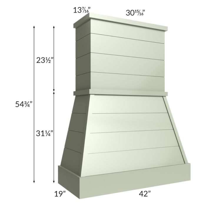 Farmhouse style wood hood that comes with a stainless steel liner. The chimney height of 23-1/2" can be trimmed on site, if needed. Blower is not included and would need to be purchased separately. The chimney depth is 13-7/16" and the width is 30-15/16".