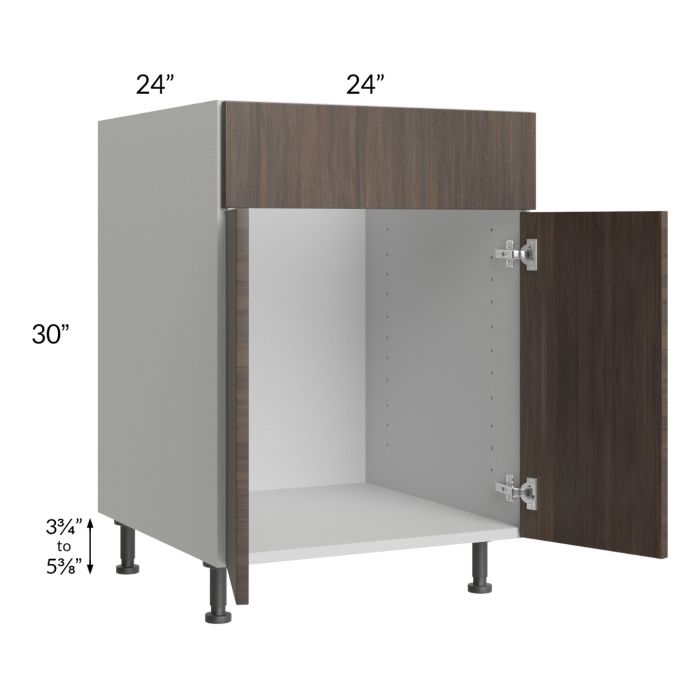 Sink base cabinet with 2 doors and (1) 6-3/4" false drawer front. This cabinet will have no shelves (the sides will come pre-drilled with shelf clip holes if loose shelves are needed - which need to be purchased separately). Black, adjustable, plastic furniture feet will also be included which will add 3-3/4" to 5-3/8" to the 30" height.