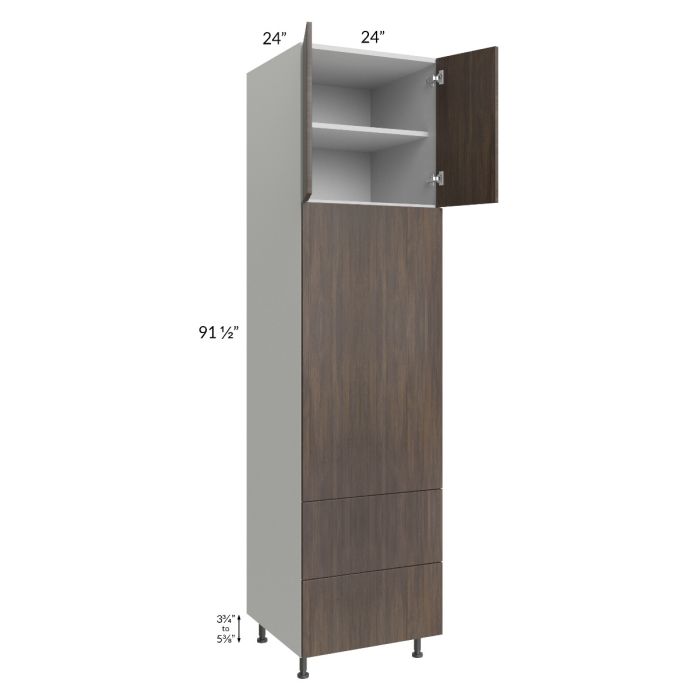 Combo oven cabinet with two 23-7/8" high doors on top with one shelf, and two 11-7/16" high drawers on bottom (height is drawer front height). The oven cabinet has a full panel that will need to be cut on site, the maximum cutout is 22"W x 43-3/4"H. When using two appliances, it is recommended to provide support for the top appliance; PLY-3/4 can be used and would need to be purchased separately, and then installed on site. Black, adjustable, plastic furniture feet will also be included which will add 3-3/4" to 5-3/8" to the 91-1/2" height.
