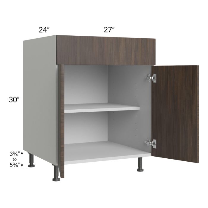 2 door base cabinet with (1) 18" deep adjustable shelves and 1 drawer. Black, adjustable, plastic furniture feet will also be included which will add 3-3/4" to 5-3/8" to the 30" height.