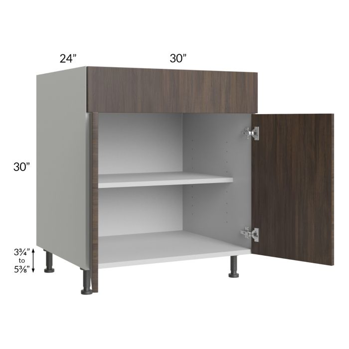 2 door base cabinet with (1) 18" deep adjustable shelves and 1 drawer. Black, adjustable, plastic furniture feet will also be included which will add 3-3/4" to 5-3/8" to the 30" height.