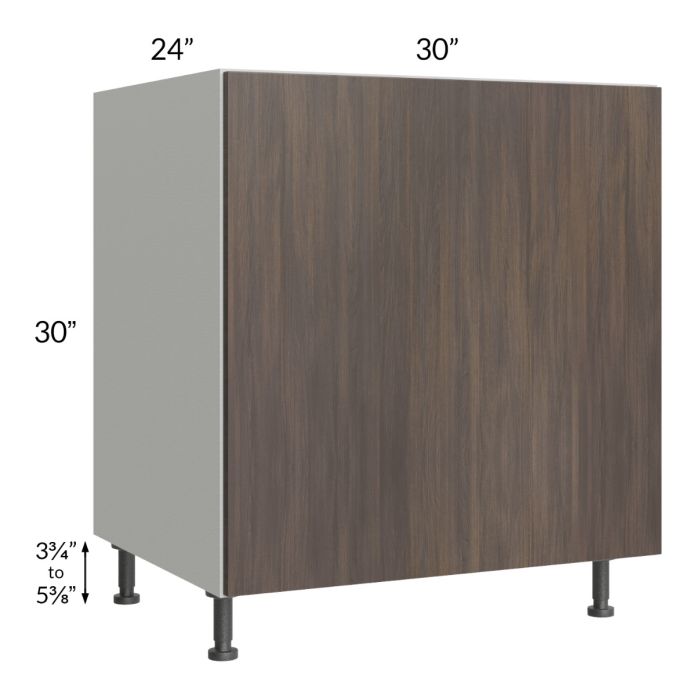 Base oven cabinet. The front panel is attached with clips for easy removal and install. Once removed, the opening will need to be cut, the maximum it can be cut is 28-1/2"W x 28-1/2"H, then the panel will be reattached back onto the cabinet. To avoid damage to the frame and side panels, please apply extra care when cutting the front panel, blue masking tape is the most commonly used to avoid splintering (strong adhesives must be avoided to avoid pulling the finish off). Black, adjustable, plastic furniture feet will also be included which will add 3-3/4" to 5-3/8" to the 30" height. *A heat shield will need to be used on both sides of an oven base cabinet or range-top base cabinet to shield the adjacent cabinet boxes from the oven heat. This can be added from the 'View Options' area for this cabinet. Each heat shield will be 30" high and can be cut to size, as needed (sold in quantities of 1, a quantity of 2 must be ordered to receive 2 heat shields).*