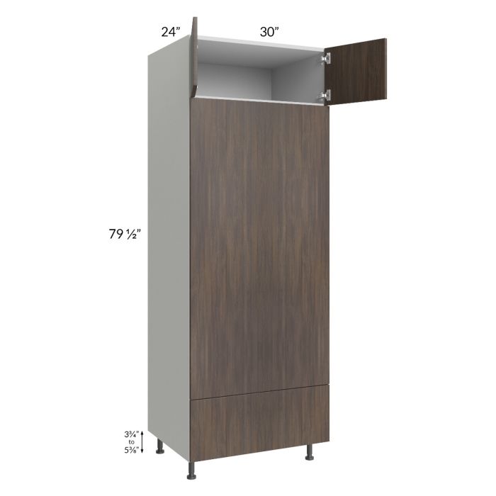 Double oven cabinet with two 11-7/8" high doors on top and one 11-7/16" high drawer on bottom (height is drawer front height). The oven cabinet has a full panel that will need to be cut on site, the maximum cutout is 28"W x 55"H. When using two appliances, it is recommended to provide support for the top appliance; PLY-3/4 can be used and would need to be purchased separately, and then installed on site. Black, adjustable, plastic furniture feet will also be included which will add 3-3/4" to 5-3/8" to the 79-1/2" height.