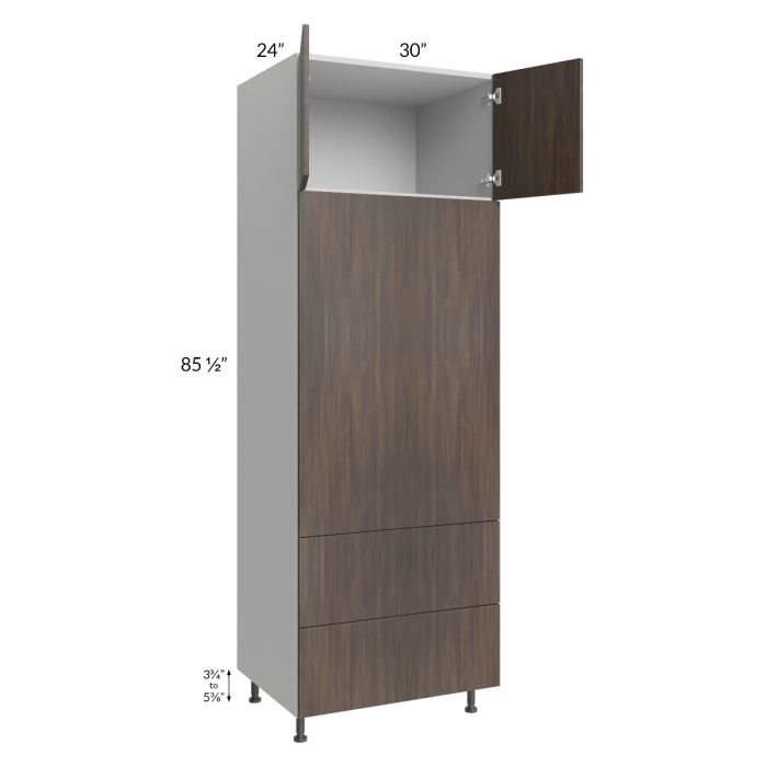 Combo oven cabinet with two 17-7/8" high doors on top and two 11-7/16" high drawers on bottom (height is drawer front height). The oven cabinet has a full panel that will need to be cut on site, the maximum cutout is 28"W x 43-3/4"H. When using two appliances, it is recommended to provide support for the top appliance; PLY-3/4 can be used and would need to be purchased separately, and then installed on site. Black, adjustable, plastic furniture feet will also be included which will add 3-3/4" to 5-3/8" to the 85-1/2" height.