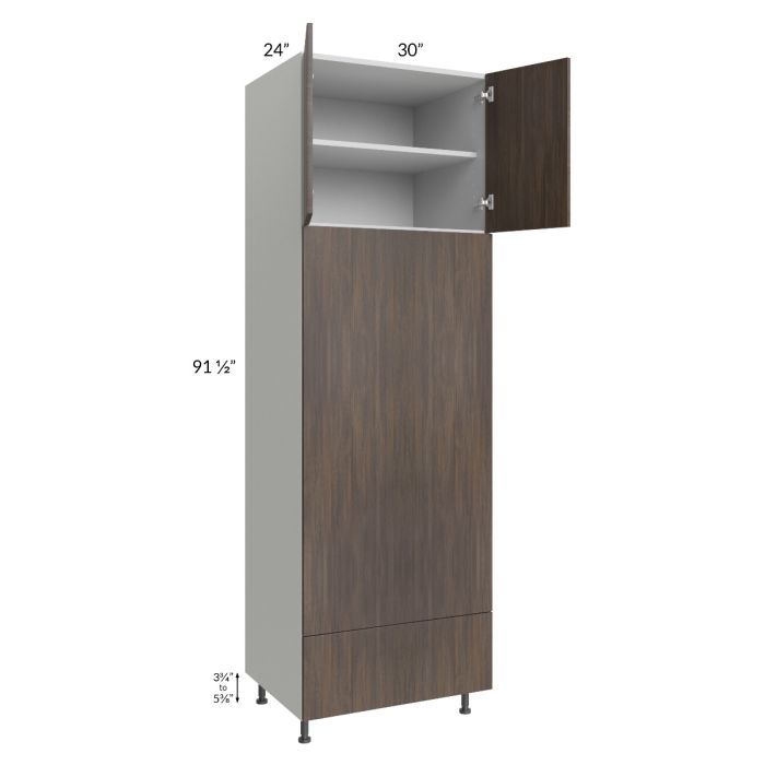 Double oven cabinet with two 23-7/8" high doors on top with one shelf, and one 11-7/16" high drawer on bottom (height is drawer front height). The oven cabinet has a full panel that will need to be cut on site, the maximum cutout is 28"W x 55"H. When using two appliances, it is recommended to provide support for the top appliance; PLY-3/4 can be used and would need to be purchased separately, and then installed on site. Black, adjustable, plastic furniture feet will also be included which will add 3-3/4" to 5-3/8" to the 91-1/2" height.