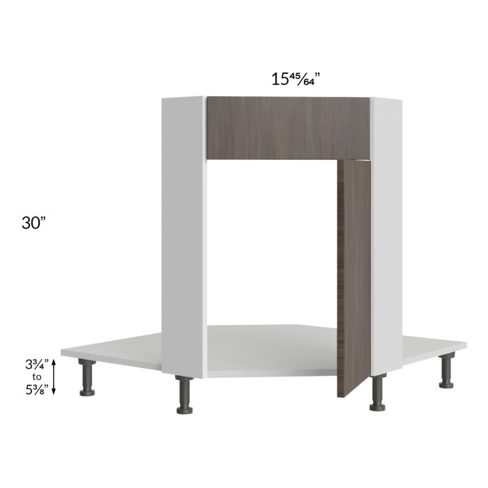 Diagonal corner sink front that will take up 36" of wall space from the corner out, on each wall, once installed. The door width is 15-45/64" and it uses 45-degree hinges with Blumotion soft close. The false drawer front is 6-3/4" high. It will include the sink front floor as well as four black, adjustable, plastic furniture feet will also be included which will add 3-3/4" to 5-3/8" to the 30" height. No shelves will be included.