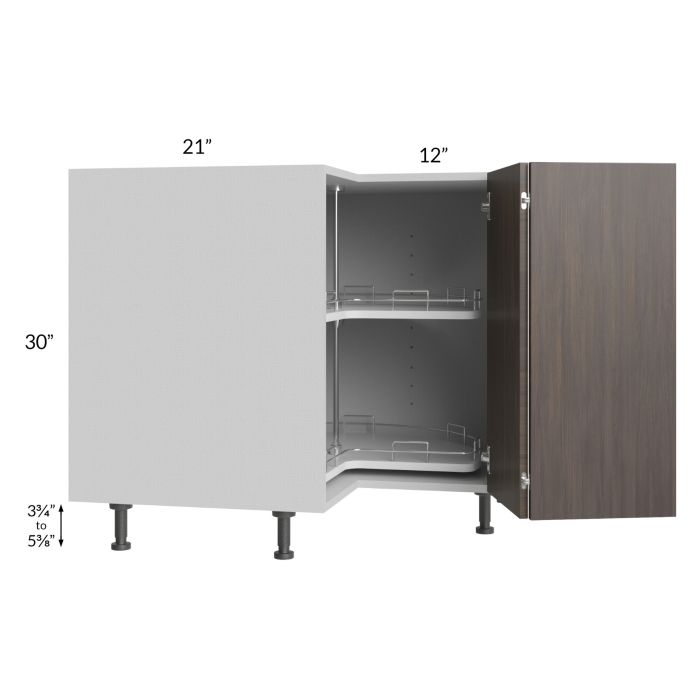 Lazy susan base cabinet that will take up 36" from the corner out, on each wall. Both wooden Lazy Susan trays rotate independently and the center tray is mounted on a 3/4" adjustable shelf. This cabinet cannot use a soft close hinge. Each bi-fold door is 12" wide. It is designed to have a smaller footprint for ease of installation (which is why the depth is 21"). Black, adjustable, plastic furniture feet will also be included which will add 3-3/4" to 5-3/8" to the 30" height.