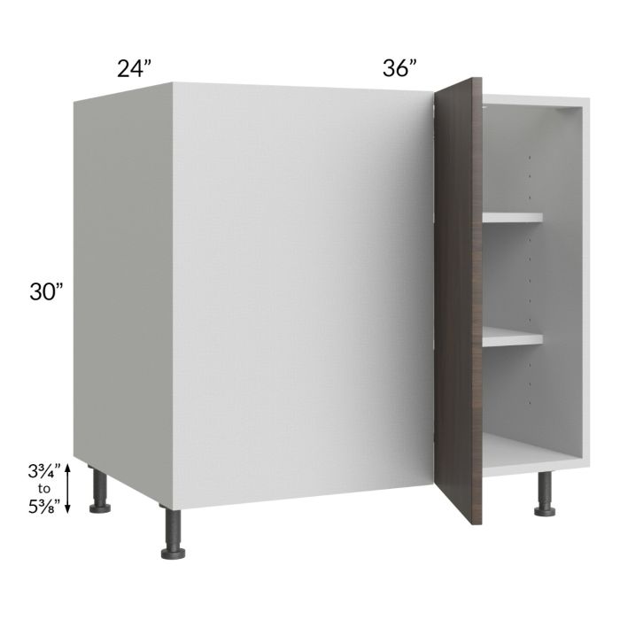 1 full height door blind base corner cabinet with no drawers and (2) 18" deep shelves. The actual width is 36", but the cabinet must be pulled at least 6" from the corner, taking up 42" of wall space. It can be pulled a max of 9", taking up 45" of wall space. The door width is 14-7/8" and the blind opening width is 14-11/32". A filler must be used between the blind and the adjacent cabinet so the doors and drawers are able to open without interference. The filler must be purchased separately. Black, adjustable, plastic furniture feet will also be included which will add 3-3/4" to 5-3/8" to the 30" height.