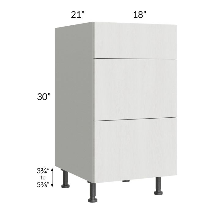 3-drawer vanity base cabinet. Top drawer front is 6-3/4", middle and bottom drawer fronts are 11-7/16" high. Black, adjustable, plastic furniture feet will also be included which will add 3-3/4" to 5-3/8" to the 30" height.