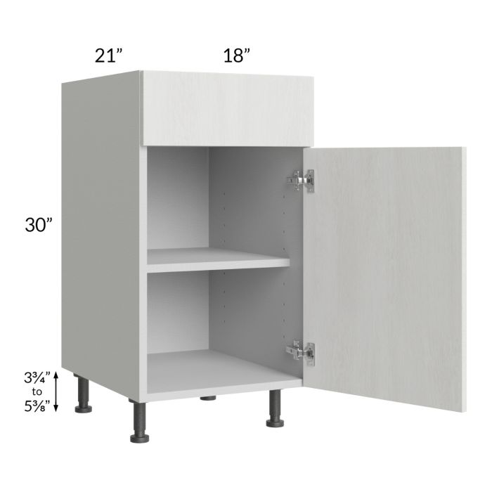 Vanity base cabinet with (1) door, (1) drawer, and (1) 18" deep shelf. The drawer front is 6-3/4" high. Black, adjustable, plastic furniture feet will also be included which will add 3-3/4" to 5-3/8" to the 30" height.