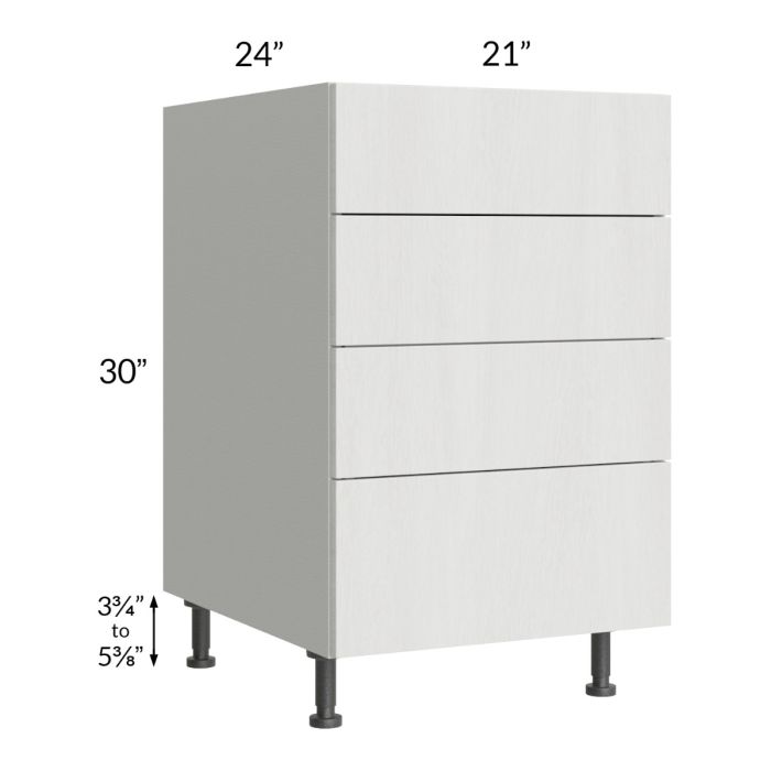 4 drawer base cabinet. Top 3 drawer fronts are 6-3/4" high and the bottom drawer front is 9-3/16" separately. Black, adjustable, plastic furniture feet will also be included which will add 3-3/4" to 5-3/8" to the 30" height.