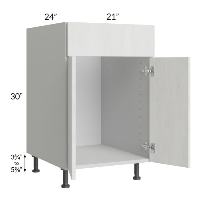 Sink base cabinet with 1 door and (1) 6-3/4" false drawer front. This cabinet will have no shelves (the sides will come pre-drilled with shelf clip holes if loose shelves are needed - which need to be purchased separately). Black, adjustable, plastic furniture feet will also be included which will add 3-3/4" to 5-3/8" to the 30" height.